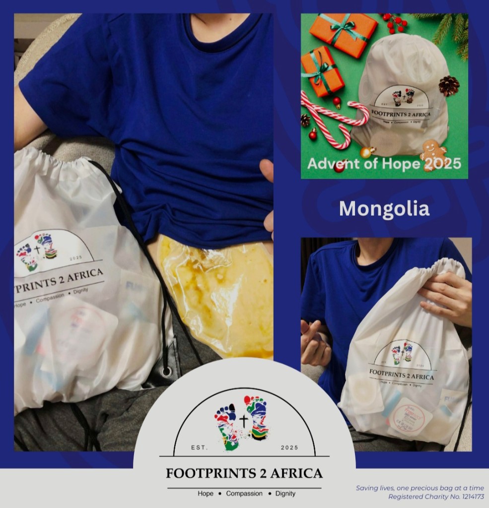 During Advent of Hope, Footprints 2 Africa delivered Bags of Hope filled with stoma supplies to individuals facing severe shortages across the world. Through this initiative, we sent Bags of Hope to South Africa, Zambia, Zimbabwe, Morocco, Mongolia, Tanzania, Malawi, Nigeria and Uganda, helping 27 people access the supplies they needed to get through the Christmas period with dignity and peace of mind.